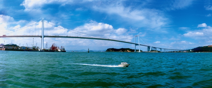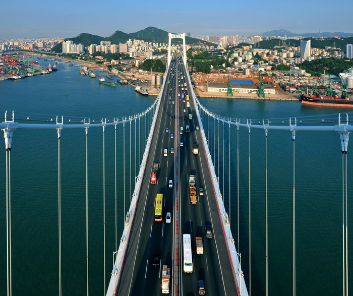 海滄大橋建設(shè)單位為廈門路橋集團,于1996年12月動工建設(shè),1999年12月建成通車,是廈門市第三條進出島通道,連接廈門東渡港和海滄投資區(qū)。大橋全長6319米,主跨長648米,橋面寬度32米,雙向6車道,設(shè)計行車時速為80km/h,日通行能力為5萬輛次。該橋是亞洲第一座、世界第二座“三跨連續(xù)全漂浮鋼箱梁懸索橋”,在國內(nèi)橋梁工程建設(shè)中率先破解了連續(xù)全漂浮鋼箱梁懸索橋施工的一系列技術(shù)難題并引入景觀工程的設(shè)計理念,代表著20世紀中國建橋最高成就,曾榮獲“中國土木工程詹天佑獎”、全國優(yōu)秀工程設(shè)計金質(zhì)獎、中國公路學(xué)會科學(xué)技術(shù)獎一等獎等獎項。