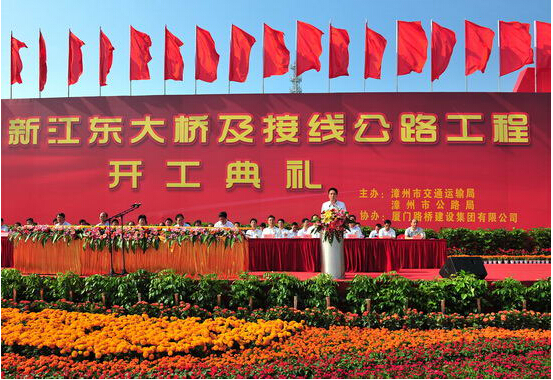 11月2日,漳州新江東大橋及接線公路工程隆重舉行開工典禮,漳州市委書記陳冬、市長吳洪芹、人大主任吳玉輝、政協(xié)主席譚培根,福建省公路局黨委書記吳順興,廈門市國資委主任林杰,廈門路橋集團董事長林小雄、總經(jīng)理程正明等出席。