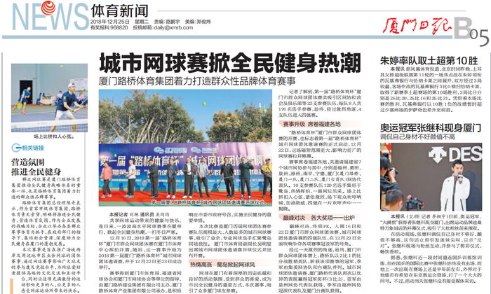 12月16日,2018第一屆路橋體育杯廈門市群眾網(wǎng)球團體賽在廈門市體育中心揮拍開賽,隨后,這一賽事升級為2018第一屆廈門路橋體育杯城市網(wǎng)球團體邀請賽,并于12月22日至23日成功舉行。
