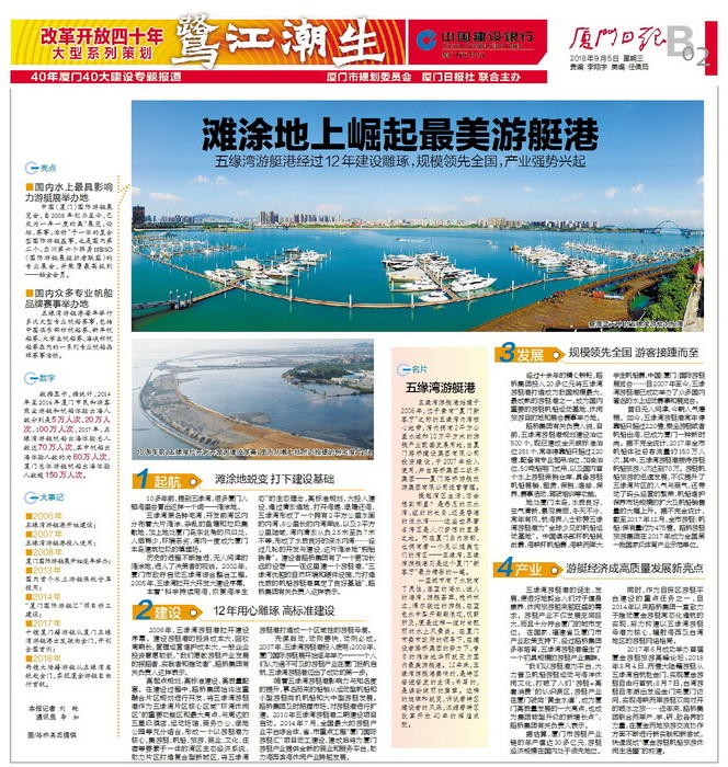 一座城市有了水就有了靈性,湛藍的海水,迷人的海灣,游艇薈萃,桅桿林立,偶爾駛過的游艇,在藍色水中犁開翩翩浪花,視野所及,便是這樣一道時尚靚麗的水上風景線。在廈門市委市政府的領導下,在建設者路橋集團的努力下,昔日的灘涂地華麗蛻變?yōu)榇箨懽蠲烙瓮Ц邸?2年來,五緣灣游艇港奏響的,是特區(qū)奮進奮發(fā)的主調(diào);書寫的,是繽紛絢麗的篇章。這樣的旋律和蛻變,訴說著特區(qū)建設者的風采,濃縮著特區(qū)改革開放40年的輝煌成就。